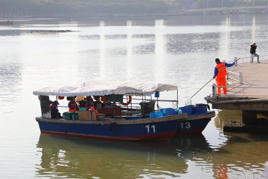 每天工作都是從早上7點鐘到下午的6點半,我們是分段來的。主要是坐船去收集河上的一些垃圾,一天巡邏清掃一次,清掃完了回來再巡邏保潔。水面和紅樹林里的垃圾都要清理。下雨天我們也要出來(工作),臺風(fēng)天就要做好防風(fēng)的工作,如果是下雨,我們一樣要出來打撈垃圾。