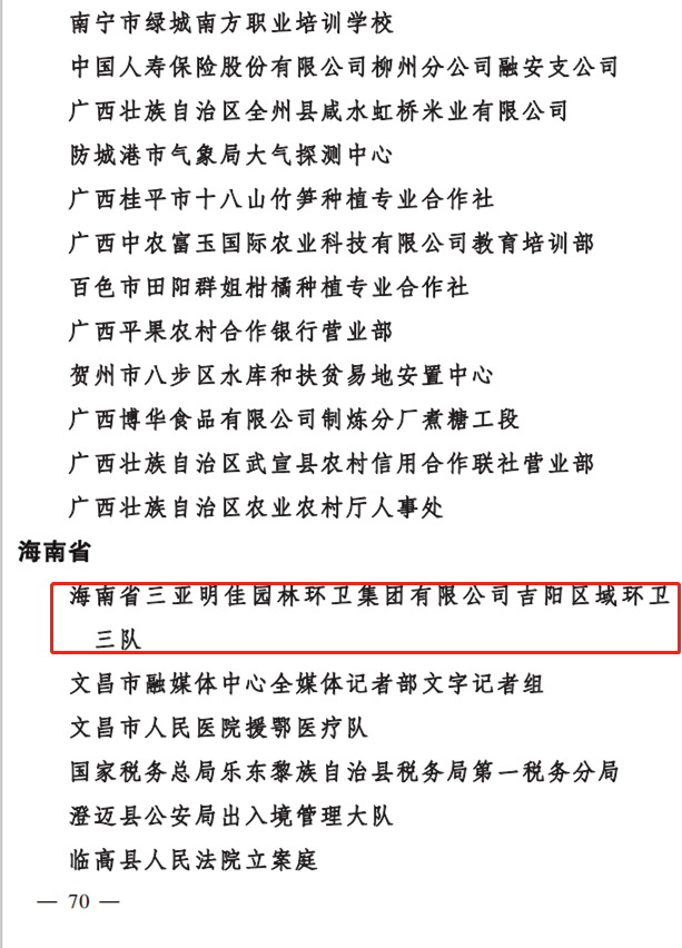 “芬芳三月,如歌巾幗?!痹趹c祝第111個(gè)三八國(guó)際勞動(dòng)?jì)D女節(jié)之際,三亞明佳園林環(huán)衛(wèi)集團(tuán)有限公司吉陽區(qū)域環(huán)衛(wèi)三隊(duì)榮獲2020年度“全國(guó)巾幗文明崗”榮譽(yù)稱號(hào)?!叭珖?guó)巾幗文明崗”是全國(guó)婦女“巾幗建功”活動(dòng)專設(shè)崗, 是全國(guó)婦聯(lián)為表彰積極為國(guó)家、為社會(huì)、為人民做出突出貢獻(xiàn),取得優(yōu)異的優(yōu)秀婦女團(tuán)體而頒發(fā)的榮譽(yù)稱號(hào)。