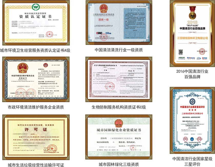 公司擁有建筑物外立面清潔養(yǎng)護(hù)施工甲級(jí)資質(zhì)、建筑物有害生物防治施工甲級(jí)資質(zhì)、建筑物日常清潔養(yǎng)護(hù)施工甲級(jí)資質(zhì)、中國(guó)清潔行業(yè)企業(yè)等級(jí)一級(jí)資質(zhì)證書、城市園林綠化企業(yè)資質(zhì)證書、有害生物防制服務(wù)機(jī)構(gòu)資質(zhì)證書C級(jí)、有害生物防制服務(wù)機(jī)構(gòu)C級(jí)資質(zhì)證書、中國(guó)清潔清洗行業(yè)國(guó)家一級(jí)等級(jí)資質(zhì)、城市生活垃圾經(jīng)營(yíng)性清掃、收集、運(yùn)營(yíng)許可證;城市生活垃圾經(jīng)營(yíng)性運(yùn)輸、處置工作許可證、環(huán)境管理體系認(rèn)證證書、城市環(huán)境衛(wèi)生經(jīng)營(yíng)服務(wù)資質(zhì)認(rèn)定證書(GB/T240012004/IOS14001:2004標(biāo)準(zhǔn))、職業(yè)健康安全管理體系認(rèn)證證書(GB/T28001—2011/OHSAS18001:2007標(biāo)準(zhǔn))、質(zhì)量管理體系認(rèn)證證書(GB/T19001—2008/iOS9001:2007標(biāo)準(zhǔn))、市政環(huán)境清潔維護(hù)服務(wù)企業(yè)資質(zhì)證書